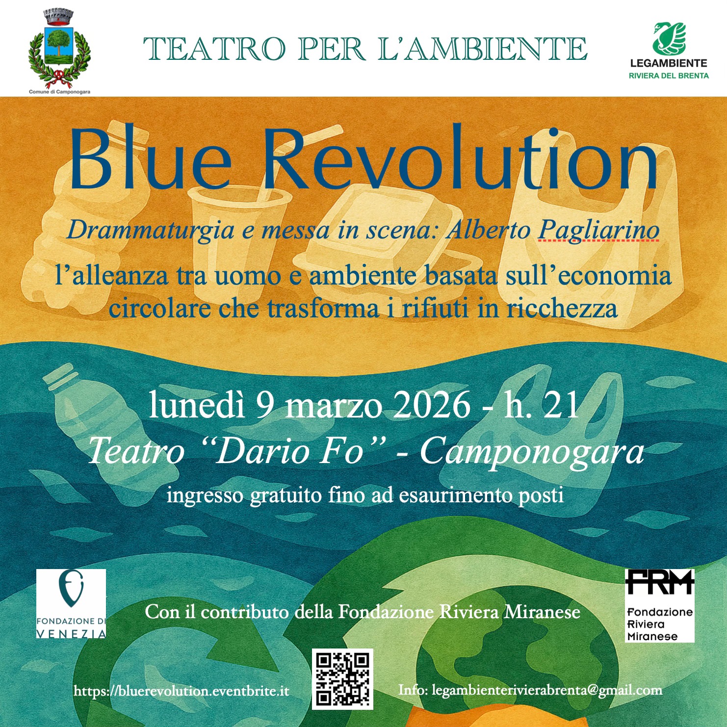 Lunedì 9 marzo alle ore 21:00 presso il teatro Dario Fo di Camponogara si terrà lo spettacolo teatrale “Blue Revolution“.L’iniziativa nasce con l’intento di riflettere sulle tematiche ambientali attraverso il